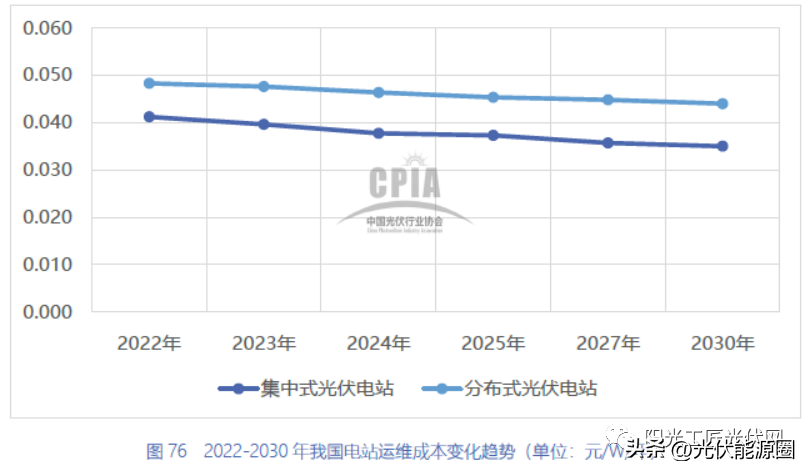 2022 年,分布式光伏系统运维成本为0.048 元/(W·年),集中式地面电站为0.041 元/(W·年),较2021 年小幅下降。预计未来几年地面光伏电站以及分布式系统的运维成本将略有下降。