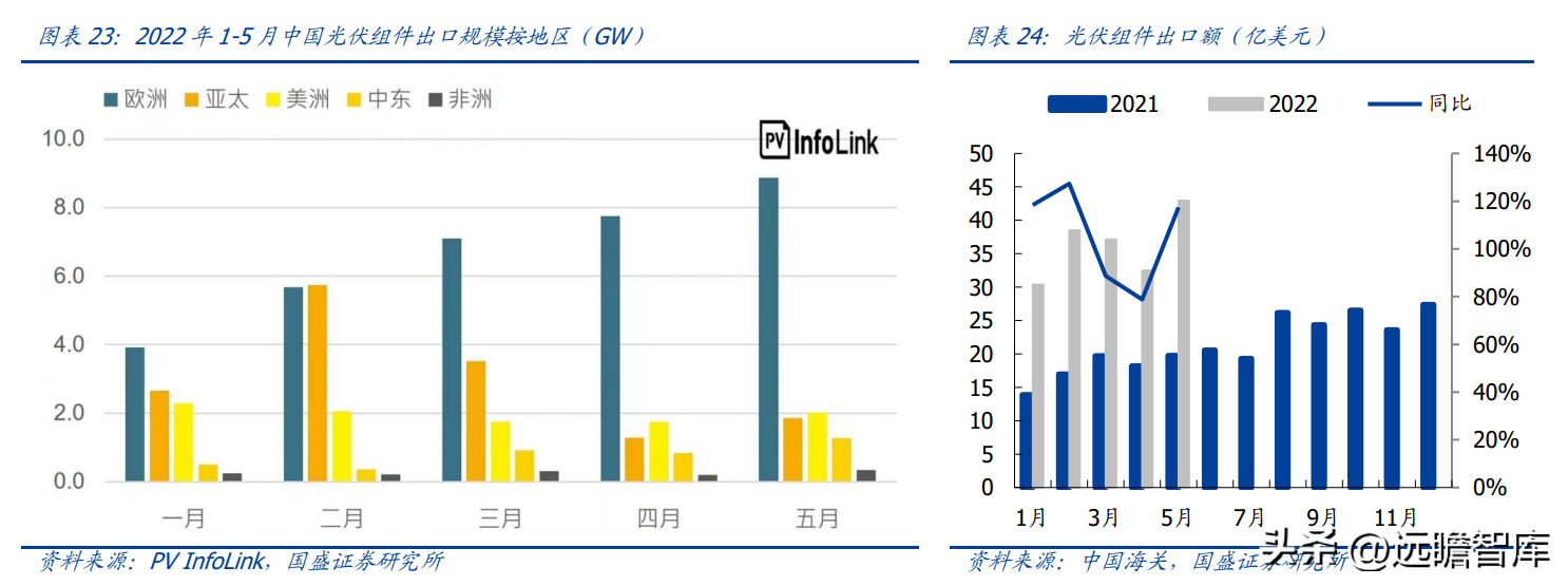 2022 年 1-4 月中国组件出口欧洲规模约 24.4GW,同比大幅增长 115%,占同期总出口组件规模约 45%。